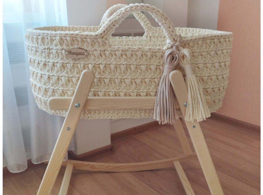 Люлька для новорожденного из хлопка с деревянной подставкой.